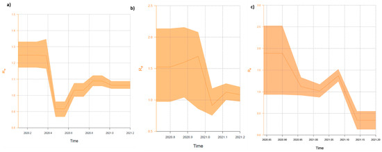 Birth–death skyline plot (BDSKY) of the Polish SARS-CoV-2 outbreaks. (a) Clade 1 (lineages: B.1.1.*—for details see Supplementary Materials); (b) Clade 2 (lineage: B.1.258); and (c) Clade 3 (lineage: B.1.221). Re estimates obtained using the BDSKY model over five equidistant intervals. The curves and the orange shaded areas show the mean Re values and the 95% confidence intervals. The Y axes indicate R values, and X axes time in years.