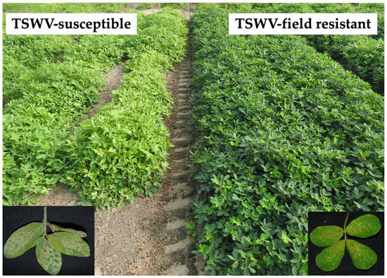 The use of resistant cultivars is one of the most effective tactics used for managing the incidence of TSWV and reducing the impact of spotted wilt in peanut production [2,3]. Intensive breeding programs since the 1990s in Georgia and Florida have led to the development of three generations of resistant cultivars with incremental field resistance to TSWV in each generation [3,11,12]. Under TSWV pressure, field-resistant cultivars display less severe symptoms and produce higher yields when compared with TSWV-susceptible cultivars (Figure 1) [3]. Despite the extensive usage of TSWV field-resistant cultivars over the past two decades, information on host-virus interactions at both macro and micro levels is limited, and the mechanism of resistance is unknown.