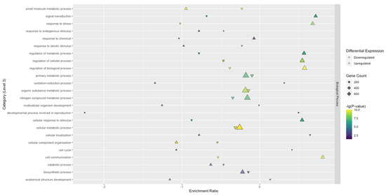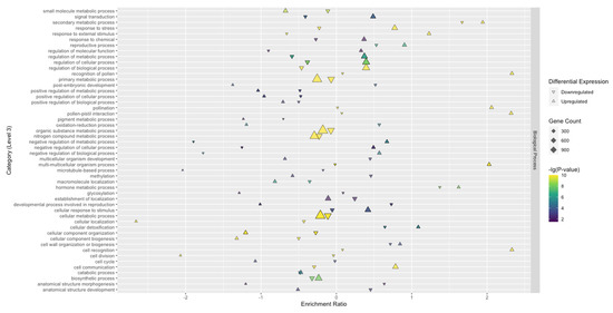 Genes were annotated by comparison with the National Center for Biotechnology Information non-redundant (NCBI nr) database using the Blastx algorithm [46,53,54] with an E-value cutoff of 1.0 × 10−5 and a high-scoring segment pair (HSP) length cutoff of 33. The characterized genes were assigned Gene Ontology (GO) terms under three main categories: biological process, molecular function, and cellular component using the GO database through Blast2GO [55]. GO terms (functional annotations) were assigned to genes with an E-value of 1.0 × 10−6. Subsequently, the Kyoto Encyclopedia of Genes and Genomes (KEGG) [56,57] analysis using the default parameters was performed to identify the biochemical pathways in DEGs. All annotations were performed using OmicsBox v1.4.11 [58,59]. Visualization of GO terms was performed using WEGO 2.0 [60,61] and a custom R script. For gene enrichment comparisons, the enrichment ratio was calculated using the log2 ratio of DEGs (upregulated or downregulated) within the total/non-significant genes within the total.