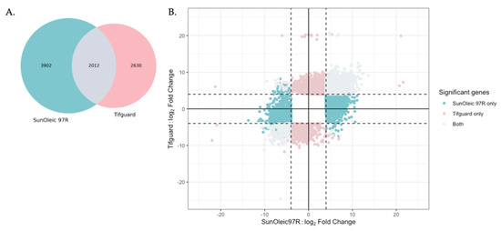 (A) Venn diagram of shared differentially expressed genes in SunOleic 97R (blue) with 3902 genes and Tifguard (pink) with 2630 genes in response to TSWV infection; (B) Log fold-change expression differences between the TSWV-infected and non-infected cultivars: SunOleic 97R (x-axis) and Tifguard (y-axis). Cutoff set for |log2FC| > 4 (dashed lines) and p-value cutoff > 0.05 in order to show DEGs per cultivar. Overlapping DEGs present in both cultivars are mostly expressed in the same direction (grey) with 2012 genes.