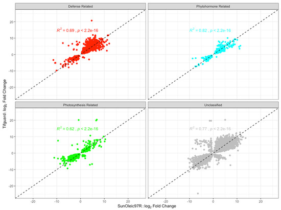 DEGs pertaining to defense, phytohormones, and photosynthesis in relation to TSWV infection were used to investigate the correlation of directionality and magnitude of gene regulation between the two cultivars (Figure 7). Defense-related DEGs showed a Pearson’s correlation coefficient of R2 = 0.69 between the two cultivars. The correlation coefficients of phytohormone- and photosynthesis-related DEGs were R2 = 0.82 and R2 = 0.62, respectively, between the two cultivars. The correlation coefficient of directionality for all DEGs was R2 = 0.78 (Figure S10). A correlation comparison between defense-related genes and the remaining uncategorized genes was statistically significant (p < 0.001). There was also statistical significance (p < 0.001) in the correlation comparison between the photosynthesis and uncategorized genes.