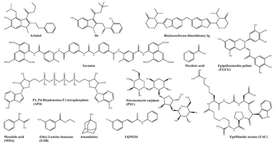 Chemical structure of virus-targeting compounds. Inhibitors of viral entry and membrane fusion: arbidol, IIc, suramin, epigallocatechin gallate, bis(benzofuran-thiazolidone) 3g, and LQM334. Inhibitor of the viral capsid protease: picolinic acid, mandelic acid, ethyl 3-aminobenzoate, P1, P4-di(adenosine-5′) tetraphosphate, eptifibatide acetate, and paromomycin sulphate. Inhibitor of 6K Protein: amantadine.
