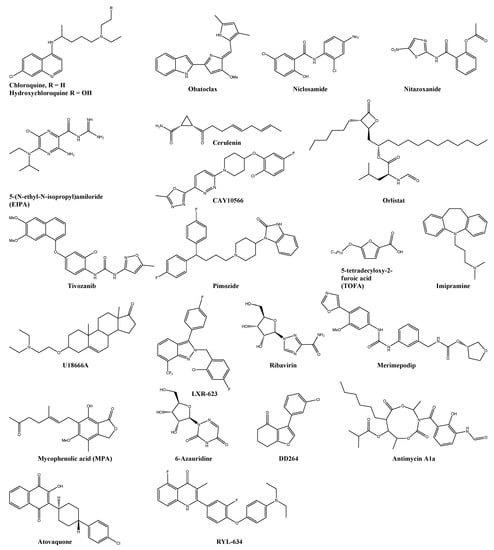 Chemical structure of selected host-targeting compounds. Inhibitor of the viral entry and membrane fusion: chloroquine, hydroxychloroquine, obatoclax, niclosamide, nitazoxanide, and 5-(N-ethyl-N-isopropyl)amiloride. Inhibitor of the lipid pathway: orlistat, cerulenin, CAY10566, tivozanib, pimozide, 5-tetradecyloxy-2-furoic acid, imipramine, U18999A, and LXR-623. Inhibitor of the pyrimidine and purine synthesis: ribavirin, merimepodip, mycophenolic acid, 6-azauridine, DD264, antimycin A1a, RYL-634, and atovaquone.