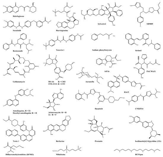 Chemical structure of selected host-targeting compounds. Inhibitor of the protein synthesis: halofuginone, harringtonine, sorafenib, sylvestrol, bortezomib, and SR9009. Inhibitor of cellular proteins: tenovin-1, sodium phenylbutyrate, sirtinol, geldanamycin, HS-10, SNX-2112, HA15, 16F16, PACMA31, and auranofin. Inhibitor of cellular enzymes: amodiaquine, desethyl-amodiaquine, aristeromycin, dasatinib, Torin 1, CND3514, berberine, miltefosine, prostatin, isothiazolo[4,3-b]pyridine, difluoromethylornithine, and DENSpm.