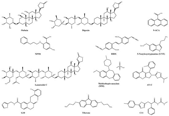 Chemical structure of selected host-targeting compounds. Inhibitors of cellular receptors: oubain, digoxin, lanatoside C, DIDS, 9-ACA, NPPB, 5-nonyloxytryptamine, and methiothepin mesylate. Immunomodulatory agents: tilorone, C11, G10, and AV-C.