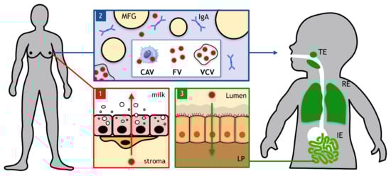 A chronology of the three main events occurring during viral mother-to-child transmission by breastfeeding. The first event consists of viral dissemination to mother’s mammary glands where viral infectious entities need to cross the mammary epithelium to be excreted in breast milk (red box). Then, viral infectious entities that could be either cell-associated viruses (CAVs), free viruses (FVs) or vesicle-cloaked viruses (VCVs) transit in breast milk in the presence of diverse components such as milk fat globules (MFGs) or immunoglobulins A (IgA). At this stage, conservation of viral infectivity needs to be ensured in breast milk (blue box). Finally, viral infectious entities can cross tonsillar (TE), respiratory (RE), and/or intestinal (IE) epithelia to infect the breastfed newborn. As an example, viral infectious entities present in the small intestine’s lumen need to cross the monostratified intestinal epithelium to reach the lamina propria (LP) (green box).