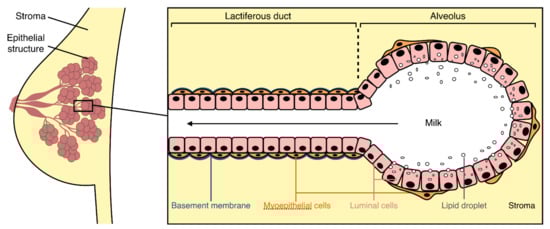 The structure of the mammary epithelium varies between the milk ducts and the mammary alveoli, but its general composition is common to both structures (Figure 2). The mammary epithelium is composed of two cellular layers linked by intercellular junctions: an internal layer in contact with the lumen of the mammary alveoli and lactiferous ducts (luminal cells), and an outer layer resting on basal lamina in contact with the mammary stroma (myoepithelial cells) [36].