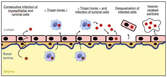 Taken together, these results suggest a role of the mammary epithelium in the production and excretion of viral particles into breast milk, but we cannot exclude that circulating immune cells infected by ZIKV (e.g., monocytes, lymphocytes, etc.) could contribute to the entry of ZIKV into the lactiferous compartment during their transmigration from the bloodstream to breast milk, with the so-called “Trojan horse” mechanism. However, persistence of viral RNA in breast milk suggests the existence of a reservoir within the mammary gland. Infected immune cells could transmigrate through the mammary epithelium during the viremic state, then newly produced particles could infect luminal epithelial cells in the alveolar compartment, serving as a reservoir in the mammary gland as long as the lactation state is maintained (Figure 3). As the nature of infectious viral entities (free, cell-associated, or vesicle-cloaked particles) in breast milk is unknown, these three mechanisms are plausible to this day.