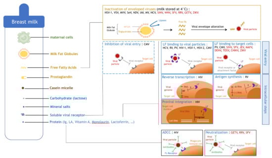 Inhibitory mechanisms of viral infectivity by breast milk components. Human breast milk contains components of different natures such as maternal cells (in green), the cream fraction (in yellow), the skim milk fraction composed of lactoserum (in blue) and casein micelles (in brown) (Figure 4). The cream fraction contains milk fat globules, free fatty acids (free FAs), and prosta-glandins. The lactoserum contains carbohydrates such as lactose, mineral salts, and a high diversity of proteins such as immunoglobulins (Ig), lactalbumin (LA), vitamin A, monolaurin, lactoferrin (LF), soluble viral receptors, and others. Lipases contained in breast milk digest triglyceride hearts of MFG when the milk fat globule membrane (MFGM) is altered, generating free FA (yellow box). Free FA inactivate enveloped viruses such as Herpes simplex virus type 1 (HSV-1), Vesicular stomatitis virus (VSV), Maëdi–Visna virus (MVV), Sendaï virus (SeV), Newcastle disease virus (NDV), type A Influenza virus (IAV), Measles virus (MV), Hepatitis C virus (HCV), and arboviruses (red) such as Sindbis virus (SINV), West Nile virus (WNV), Semliki forest virus (SFV), Ross river virus (RRV), Getah virus (GETV), and Zika virus (ZIKV) by interacting with the viral envelope and altering viral particle integrity (yellow box). Soluble viral receptors present in breast milk inhibit viral entry of viruses such as Cytomegalovirus (CMV) by interacting with viral par-ticles contained in breast milk, thus inhibiting viral binding to cell receptors on target cells (blue box, dashed line). LF inhibits viral entry by binding either to viral particles or to target cells (blue boxes, full line, first row). LF binds to HCV, Rotavirus (RV), Poliovirus (PV), type 1 Human immunodeficiency virus (HIV-1), HSV-1, Herpes simplex virus type 2 (HSV-2), or CMV. LF binds to target cells, inhibiting infection by PV, CMV, and arboviruses (red) such as SINV, SFV, Japanese encephalitis virus (JEV), Mayaro virus (MAYV), dengue virus (DENV), Toscana virus (TOSV), Chikungunya virus (CHIKV), or ZIKV. LF supposedly inhibits intracellular steps of the viral cycle like reverse transcription (RT), antigen synthesis, or proviral integration into the host cell genome by yet unknown mechanisms (blue boxes, full line, second and third rows). Maternal Igs present in breast milk can bind to viral particles, thus inhibiting their infectivity either by antibody-dependent cell-mediated cytotoxicity (ADCC) or by neutralizing (black boxes, full line) arboviruses (red) such as GETV, RRV, and SFV.