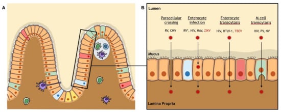 The intestinal barrier: anatomy and viral crossing. (A) The intestinal barrier is a monostratified epithelium composed of different cell types that all differentiate from pluripotent stem cells (yellow) located at the bottom of the crypts: enterocytes (orange), goblet cells (pink), Paneth cells (blue), and microfold cells (M cells) (green). Underlying the epithelium, the gut-associated lymphoid tissue is composed of free and anchored immune cells. Over the lymphoid follicles, the follicle-associated epithelium is enriched by M cells. (B) The intestinal barrier can be crossed by paracellular crossing by Rotavirus (RV), by enterocyte infection by RV (*: after paracellular crossing), Human immunodeficiency virus (HIV), Hepatitis A virus (HAV), and Zika virus (ZIKV), by transcytosis through enterocytes by HIV, type 1 Human T-cell lymphotropic virus (HTLV-1), and Tick-borne encephalitis virus (TBEV), or by transcytosis through M cells by HIV, Poliovirus (PV), and Norovirus (NV). The only arboviruses (red) that were reported to cross the intestinal barrier are TBEV and ZIKV.