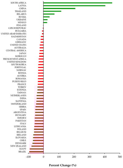 Overall, 46 out of 54 (85%) jurisdictions available in our database experienced a decline in DAA utilization during the COVID-19 pandemic (Figure 1). Among the 46 jurisdictions, the utilization of DAAs decreased on average by −43% (Standard Deviation (SD = 21)) during the first 6 months of the pandemic (March to August 2020). Decreases in DAA utilization ranged from −1% in Finland to −93% in Brazil. Among the eight countries that experienced a percent increase, the range was between +24% (Mexico) to +449% (South Africa). All countries in our database with a high prevalence of HCV (Egypt, Kazakhstan, Pakistan, Romania, Taiwan) experienced a −49% (SD = 27) average decline in DAA utilization. Decreases in DAA utilization in high prevalence countries ranged from −17% in Kazakhstan to −90% in Egypt.