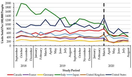 Direct Acting Antiviral units sold per 100,000 people from September 2018–August 2020 across the G7 countries. Dashed lined: declaration of the COVID-19 pandemic (March 2020).