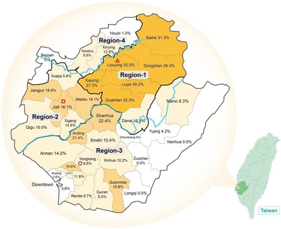 Prevalence rates of HCV GT 6 in each district of Tainan. (Blue lines: two main rivers, top: Jishui; middle: Zengwen; red hollow circle, triangle and square: locations of three campuses).