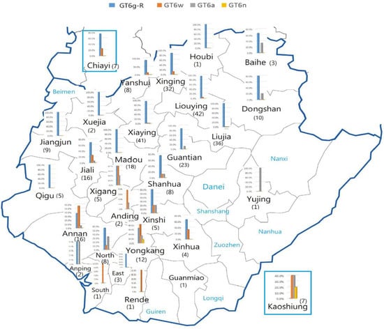 The overall numbers and prevalence rates of HCV GT 1a, 1b, 2, 3, 4, 6, and mixed types among chronic hepatitis C (CHC) patients were 119 (3.9%), 956 (31.6%), 1388 (45.9%), 19(0.6%), 7 (0.2%), 518 (17.1%), and 15 (0.5%), respectively (Table 1). There were no GT 5 and very rare GT 3 and 4 (combined less than 1%). Genotypes 2 and 1b remained two major prevalent HCV genotypes in Tainan, as supported by previous studies, but with higher GT 2 and much lower GT 1b prevalence [11,12,13,14]. HCV GT 6 prevalence rate 17.1% was significantly higher than previous studies reported but similar to our previous, smaller study (18.3%) [18]. Numbers and percentages of each HCV GT of 36 districts are shown in Table 1 and Figure 1.