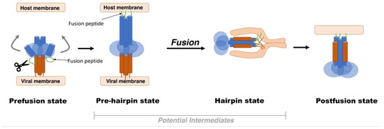Model for membrane fusion; viral surface proteins undergo drastic conformational changes in order to bring the viral and host cell membrane close to each other. Upon its activation through proteolysis, the metastable prefusion state undergoes conformational changes in the fusion subunit that result in an intermediate state termed the “prehairpin” state [65,66,67,68]. At this point, the prehairpin structure can revert to its prior state in the absence of any membrane or irreversible transition to the postfusion state [48,69,70]. Finally, to prompt the fusion process, a short hydrophobic peptide or fusion peptide is released to connect with the target membrane. This interaction induces the formation of the six-helical postfusion state that brings the virus and host cell membranes in proximity and drives the membrane fusion.