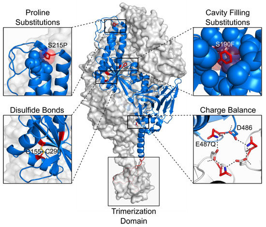 The successful application of structure-based design approaches to stabilize the prefusion conformation of the RSV fusion protein (F protein), has provided the basis for generalized strategies to stabilize class I fusion proteins [41]. This pioneering work, which led to the clinical candidate DS-Cav1, was aimed to design prefusion RSV F variants with a stabilized antigenic site Ø. The strategy involved designing a disulfide bond that prevents the postfusion state, introducing two cavity-filling substitutions that increase favorable interactions and the structural order of the protein, and appending a C-terminal T4-phage fibritin trimerization domain (“foldon”) that preserves the protein’s trimeric structure (Figure 3) [41]. The effectiveness of this approach was later supported by the massive stabilization of the prefusion F protein of the four different types of human parainfluenza viruses [43].
