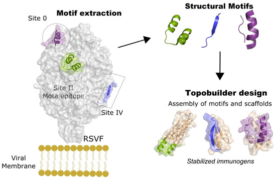 Strategy for de novo design of a trivalent epitope-focused vaccine. The neutralizing sites 0, II, and IV of RSV F were stabilized by de novo designed scaffolds using Topobuilder [121]. Topobuilder aided the construction of specific topologies that stabilize the antigenic motifs of the RSV F protein. Subsequent design and folding simulations yield stable immunogens that were used to generate a tri-scaffold vaccine. The combination of three scaffolds induced specific neutralizing antibodies against RSV F in nonhuman primates.