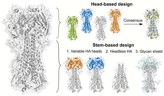 During naturally occurring infections or after the influenza vaccination, neutralizing antibodies are mostly produced against the viral HA protein [134,135]. This HA protein is structurally composed of two domains known as the head domain, which mediates the attachment of the virus to the host cell receptor, and the stem domain, which promotes the fusion between the viral and the cell membranes [136]. While the head domain denotes the immunodominant region of HA proteins and comprises most of their antigenic variability, the stem subunit is a more conserved subdominant domain [137]. Antigen design strategies focusing on HA proteins have shown promising progress toward the development of broadly reactive influenza vaccines. These design advances are divided into two main avenues: head-based and stem-based approaches.