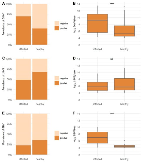 Šimenc, L.; Knific, T.; Toplak, I. The Comparison of Honeybee Viral Loads for Six Honeybee Viruses (ABPV, BQCV, CBPV, DWV, LSV3 and SBV) in Healthy and Clinically Affected Honeybees with TaqMan Quantitative Real-Time RT-PCR Assays. Viruses 2021, 13, 1340. https://doi.org/10.3390/v13071340