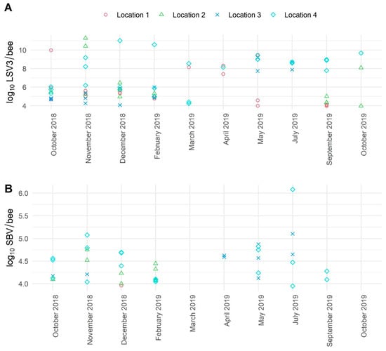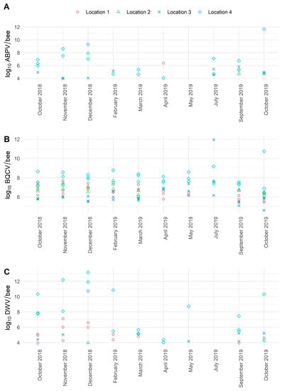 - Tentcheva, D.; Gauthier, L.; Zappulla, N.; Dainat, B.; Cousserans, F.; Colin, M.E.; Bergoin, M. Prevalence and seasonal variations of six bee viruses in Apis mellifera L. and Varroa destructor mite populations in France. Appl. Environ. Microbiol. 2004, 70, 7185–7191. [Google Scholar] [CrossRef] [Green Version]