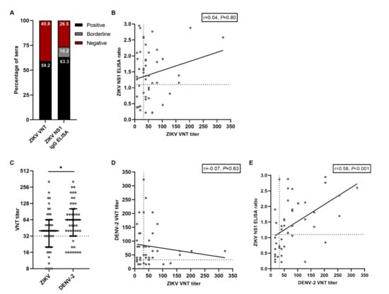 Statistical differences between sex, comorbidities and age within the ZIKV VNT or ZIKV NS1 IgG ELISA positive/negative groups were assessed with Pearson χ2 test and a t-test. Differences in ZIKV and DENV-2 nAb titers were tested with the Mann–Whitney U test. Spearman correlation was used to test for correlations between the different serological tests used in this study. All statistical analyses were performed with IBM SPSS for Windows, version 24. A P value ≤ 0.05 was considered to be a statistically significant difference.