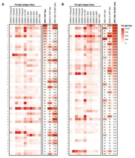 Heatmap of results from the different serological assays used in this study. A: IgG antibody titers for DENV1–4 Equad and DENV1–4 and ZIKV NS1 antigens determined with a protein microarray. Corresponding ZIKV and DENV-2 VNT titers and ZIKV NS1 IgG ELISA ratios from all participants are shown on the right. Antibody patterns are ranked from highest to lowest ZIKV VNT titer. B: Protein microarray IgG antibody titer patterns for DENV1–4 Equad and DENV1–4 and ZIKV NS1, ZIKV and DENV-2 VNT titers and ZIKV NS1 IgG ELISA ratios from all participants, ranked from highest to lowest ZIKV NS1 ELISA ratio. Numbers on the left Y-axis are the study numbers of the participants in this study. PA; protein microarray, Equad; envelope proteins containing four amino acid mutations in the highly conserved fusion loop domain to reduce flavivirus cross-reactivity, VNT; virus neutralization test.