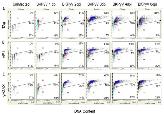 Simultaneous quantification of antibody staining (TAg, VP1 or γH2AX) and cell DNA content was carried out as previously described []. Briefly, antibody staining of cell monolayers was carried out as described in Section 2.3. Stained cell monolayers on cover slips were then incubated with 500 μg/mL RNase A, 50 μg/mL propidium iodide (PI) at 37 °C for 30 min and mounted in 90% glycerol/10% PBS containing 100 μg/mL PI. Data were acquired with an iCys research laser scanning cytometer (Compucyte, Cambridge, MA, USA; now Thorlabs, Newton, NJ, USA). Cytometric Analysis Software version 3.2.5 (iGeneration) was used for data acquisition and analysis. Instrument settings were 5 mW laser power (488 nm argon) with detector voltages set at 35 V green channel with a 530/30 optical filter and 33 V long red channel with a 650 LP optical filter. For reanalysis, the contour primary minimum area of 20 µm2 was set to exclude cell fragments and a maximum area of 340 µm2 to allow doublet discrimination. The instrument was set to acquire data on 5000 cells per sample and the following parameters on each cell were collected and stored: these included red fluorescence (DNA [PI]), green fluorescence (TAg, VP1 or γH2AX) and the cell coordinates (location). The data were first displayed as a plot of red fluorescence per cell (DNA, in linear scale on the x axis) vs. the number of cells (count) in that channel on the y axis also in a linear scale to determine cell cycle position. The panels on the right of Figure S2 are a representation of this initial data plot without the coloring of the cell cycle phases. The left-hand panels of Figure S2 are the plots of the DNA content (x axis) vs. the antigen fluorescence in log on the y axis but not gated (colored). G1, S, G2 and >G2 phases were gated, based on the G1 and G2 phase peaks of uninfected cells, and colored to represent the cells position in the cell cycle (cyan for G1 phase cells, black for S phase cells, red for G2 phase cells and blue for >G2 cells. The data were then displayed as dot plots of DNA per cell (x axis, linear scale, “Long Red Integral”) and green fluorescence (TAg, VP1 or γH2AX) per cell (y axis, log scale, “Green Integral”). To compare positive and negative antigen-expressing cells (TAg, VP1 or γH2AX), gates were placed on the positive, expressing cells (R5) and non-expressing cells (R4). This was the format of presentation in all LSC dot plots. Cells with extremely low levels of green fluorescence were present in the R7 gate at the very bottom of scatter plots. The vast majority of these cells had a G1/G0 phase, 2C DNA content regardless of the number of days post-infection, consistent with the absence of viral protein expression or cell cycle progression (Figure S2, right-hand panels).