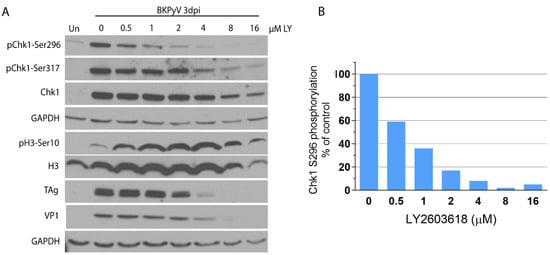 Clinically-relevant inhibitors of enzymes in DDR pathways may be valuable both for preventing kidney damage due to BKPyV replication and for gaining a mechanistic understanding of the DDR in BKPyV infection. Ongoing clinical trials of Chk1 inhibitors as anticancer agents [] led us to examine a clinically-tested Chk1 inhibitor for its effect on BKPyV infection in vitro. The Chk1 inhibitor LY2603618 (Rabusertib) has been evaluated in at least seven phase I/II clinical trials [] and is the most specific Chk1 inhibitor []. To determine whether this inhibitor could effectively inhibit Chk1 activity in our system, BKPyV-infected RPTECs were treated with a concentration range of LY2603618 for 3 days. Autophosphorylation of Chk1-Ser296 served as the primary indicator of Chk1 activity. As shown in Figure 4A,B, a concentration-dependent inhibition of Chk1-Ser296 phosphorylation was observed with an IC50 of 640 nM and greater than 90% Chk1 inhibition at 4 µM and above.