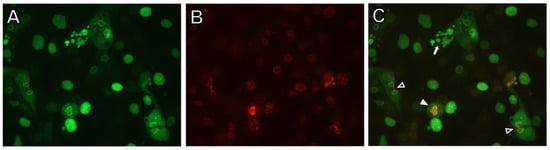 Abnormal mitotic events in LY2603618-treated BKPyV-infected cells. Quiescent RPTECs were infected with BKPyV Gardner (MOI = 10 IU/cell) for 1.5 h. The inoculum was removed and culture medium containing 4 µM LY2603618 DMSO was added. Cells were fixed at 3 dpi. Cells were first incubated with combined primary antibodies, rinsed and then incubated with combined secondary antibodies. (A) Anti-TAg (Pab416) and Alexa 488 goat anti-mouse IgG; (B) anti-pH3-Ser10 and Alexa 594 goat anti rabbit IgG; (C) merged TAg and pH3-Ser10 images. Open arrowheads: pH3-Ser10-stained intercellular bridges in telophase cells; filled arrowhead: A single cell containing two connected TAg and pH3-Ser10-stained chromatin masses; filled arrow: TAg-stained fragmented nuclei. (40× objective).