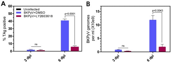 LY2603618 limits spreading BKPyV infection in vitro. Parallel cultures of quiescent RPTECs were infected with BKPyV Dunlop (MOI = 0.1 IU/cell) and treated with either 4 µM LY2603618 or 0.02% DMSO beginning at 1.5 hpi. Cells and culture media were harvested at 3 dpi and 6 dpi. For cultures harvested at 6 dpi, media including LY2603618 or DMSO was replaced at 3 dpi. (A) Percent TAg-positive cells. Cells on cover slips were fixed, stained with anti-TAg (PAb416), followed by goat anti-mouse Alexa 594. Cover slips were stained with DAPI prior to immunofluorescent microscopy and quantification of percent TAg-positive cells by Cell Profiler Count and Score software. (B) BKPyV DNA release into culture media. DNA was purified from culture media and analyzed by real-time PCR using BKPyV-specific primers. Error bars indicate standard errors. Statistical significance was determined with a paired, two-tailed t-test (GraphPad Prism).