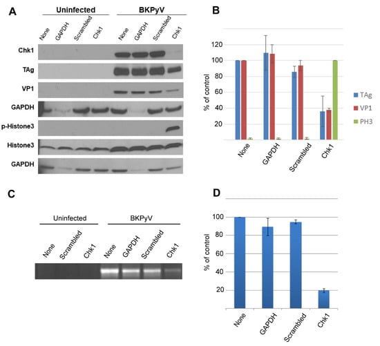 RPTECs were plated and grown to near confluence in complete REGM. Culture medium was then replaced with REBM/0.5% FBS for two days. RNAi duplex-Lipofectamine RNAiMAX complexes were made by first preparing 60 nM solutions of the following RNAi duplexes (all from Ambion): Chk1 (# 4390824), GAPDH (# 4390849), negative control #1 siRNA (# 4390843) in Opti-MEM I Reduced Serum. Lipofectamine RNAiMAX was diluted 1:50 in Opti-MEM Reduced Serum Medium. The diluted RNAi duplexes were combined with the diluted Lipofectamine RNAiMAX and incubated for 20 min at room temperature. Medium was removed from RPTEC cultures and replaced with Opti-MEM Reduced Serum Medium. The RNA-duplex-Lipofectomine RNAiMAX complexes were then added to a final siRNA concentration of 5 nM. The plates were gently rocked and placed in a 37 °C CO2 incubator. Following a 24 h treatment with siRNA, the complexes were removed and RPTECs were infected with BKPyV (MOI = 10) in Opti-MEM Reduced medium for 90 min at 37 °C in a CO2 incubator. The virus inoculum was removed and replaced with Opti-MEM Reduced Medium. Plates were placed in 37 °C, 5% CO2 incubator for 72 h. Parallel cell cultures were either trypsinized and pelleted for viral DNA analysis or directly lysed in 1× sample buffer for immunoblotting.