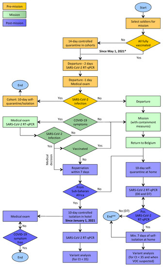 Soldiers who test positive during a mission abroad and are not vaccinated for COVID-19 are automatically repatriated to Belgium within seven days; vaccinated soldiers upon medical decision only (Figure 1). Upon their return to Belgium, all soldiers complied with the national testing, isolation, and contact tracing measures. During the study period, this meant that returning soldiers were sampled and tested for SARS-CoV-2 viral load at days 0 and 7 and were required to quarantine themselves at home for 10 days. If the test was positive on day 7, self-isolation was required for at least 7 more days. Persons considered as high-risk contacts of a SARS-CoV-2-positive soldier were subjected to the same regimen. In response to the increased incidence of SARS-CoV-2 variants of concern (VOCs), in December 2020, the post-mission quarantine and isolation measures were modified. Since 1 January 2021, soldiers repatriated from Sub-Saharan Africa, who tested positive for SARS-CoV-2 by RT-qPCR, are isolated in a hotel for a minimum of 10 days after the first positive test result and until symptoms have fully resolved (incl. > 3 days without fever).