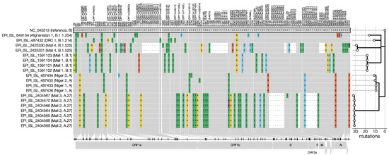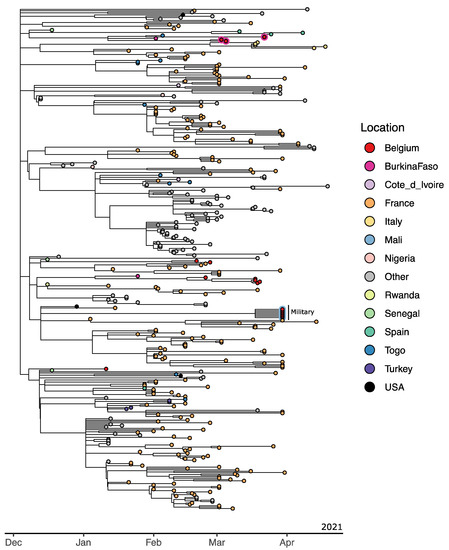Whole-genome sequences were compared with the reference SARS-CoV-2 Wuhan genome (NC_045512.2) and with all SARS-CoV-2 genomes submitted to the Global Initiative on Sharing All Influenza Data (GISAID) repository (https://www.gisaid.org accessed on 6 July 2021) [21] and to the National Center for Biotechnology Information (NCBI). BLOSUM62 substitution scores were calculated to evaluate amino acid changes and their potential to alter the functionality of the proteins of interest [22]. Negative scores are predicted as “bad”, i.e., these substitutions are not often observed in nature. The obtained SARS-CoV-2 genome sequences were submitted to GISAID. The genomes correspond to returning soldiers from Niger (access IDs: EPI_ISL_487433-EPI_ISL_487436), Mali (EPI_ISL_1591101-EPI_ISL_1591104), Afghanistan (EPI_ISL_649154), the Democratic Republic of the Congo (EPI_ISL_487432), and again from Mali (EPI_ISL_2404564-EPI_ISL_2404570, and EPI_ISL_2425330-EPI_ISL_2425331). Importantly, travel history for each infected individual was added to the corresponding GISAID entry in the “Additional location information” field so that this information can be exploited in various data analyses [23].