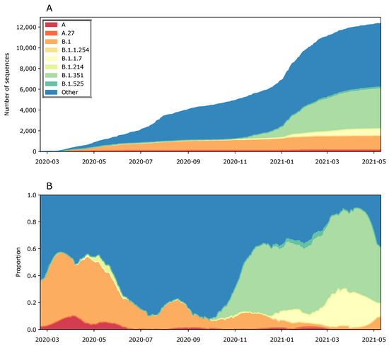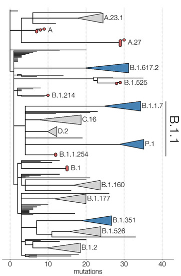 - Calvignac-Spencer, S.; Budt, M.; Huska, M.; Richard, H.; von Kleist, M.; Kröger, S.; Semmler, T.; Wolff, T.; Hölzer, M. Emergence of SARS-CoV-2 Lineage A.27 in Germany, Expressing Viral Spike Proteins with Several Amino Acid Replacements of Interest, Including L18F, L452R, and N501Y in the Absence of D614G. Virological.org 15 May 2021. Available online: https://virological.org/t/emergence-of-sars-cov-2-lineage-a-27-in-germany-expressing-viral-spike-proteins-with-several-amino-acid-replacements-of-interest-including-l18f-l452r-and-n501y-in-the-absence-of-d614g/693/1 (accessed on 2 June 2021).