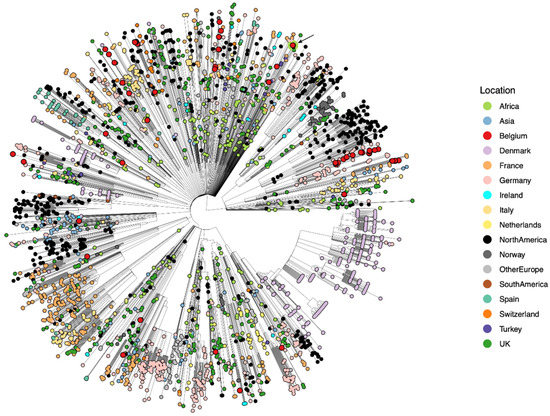 - Hadfield, J.; Megill, C.; Bell, S.M.; Huddleston, J.; Potter, B.; Callender, C.; Sagulenko, P.; Bedford, T.; Neher, R.A. Nextstrain: Real-time tracking of pathogen evolution. Bioinformatics 2018, 34, 4121–4123. [Google Scholar] [CrossRef] [PubMed]
