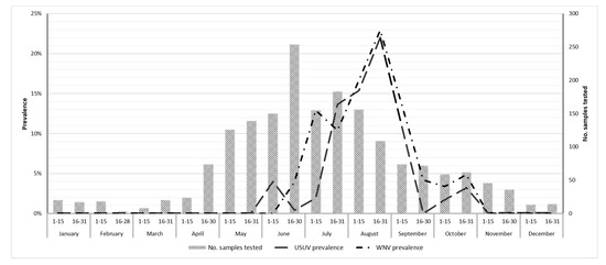 Usutu and West Nile viruses are Flaviviruses maintained in the environment through an enzootic cycle involving mosquitoes and wild birds. In temperate climate areas, the seasonal pattern of the infection shows an increase during warmer months, owing to the involvement of mosquitoes in the transmission cycle of the virus.
