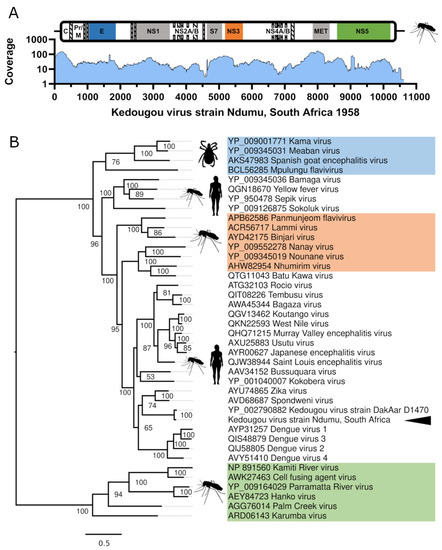 Genome coverage and phylogenetic position of the Kedougou virus isolate (Ndumu, South Africa). (A) Genome schematic showing protein domains as colored boxes, C; capsid, prM; pre-membrane, E; Flavivirus envelope glycoprotein, NS; non-structural proteins, pr; flavivirus propeptide, M; flavivirus envelope glycoprotein M; S7; flavivirus NS3 serine peptidase S7, MET; FtsJ-like methyltransferase. Coverage was obtained using samtools depth and plotted using Graphpad Prism (v9.0). (B) Consensus maximum-likelihood tree of representatives of the Flavivirus genus constructed using IQ-TREE v2.1.2 and the LG+F+R6 amino acid substitution model with 1000 bootstraps. The insect only classical insect flavivirus clade is indicated in green, tick flavivirus clade is indicated in blue and lineage two insect only clade shown in orange. The AR1071 Ndumu Kedougou virus isolate is marked with the arrowhead.