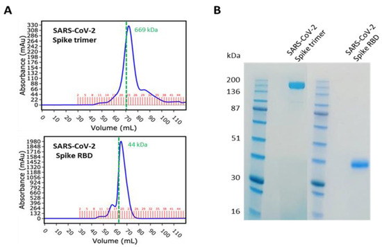 The SARS-CoV-2 spike trimer (aa14–1213) and RBD (aa319–541), both with a C-terminal 6His tag, were expressed and purified by Peak Proteins Ltd., Macclesfield, UK (www.peakproteins.com, accessed 13 July 2021), along with human ACE2 ECD (aa19–615) with a C-terminal Avi tag. The proteins were produced in HEK293T cells. The spike proteins were purified by nickel affinity chromatography, followed by size exclusion chromatography (Figure 1). The ACE protein was purified by anion exchange chromatography, followed by size exclusion chromatography. Concentration was determined by A280 correcting for extinction coefficient.