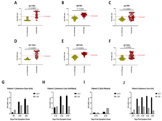 OD values representative of antibody reactivity in sera from pre-COVID-19 and confirmed SARS-CoV-2 patients. (A–C) Results of samples tested against RBD. (D–F) Results of samples tested against full-length spike protein. Statistical analysis was performed using Mann–Whitney U tests in GraphPad Prism. The samples represented here were taken >7 days post symptom onset and include 103 pre-COVID-19 and 91 SARS-CoV-2 positive samples. Horizontal lines represent mean values and samples were performed in triplicate. (G–J) Examples of results from longitudinal samples.
