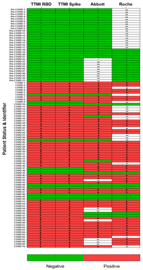 Comparison between the SARS-CoV-2 anti-spike serology assay and commercially available assays. Samples tested with the RBD and spike proteins are shown as independent assays and are comprised of IgG1 and IgM patient data. These were compared with the same samples tested by the Roche and/or the Abbott assays where n = 69 and n = 84, respectively. Samples indicative of seropositivity are shown as “+”and negative as “−“. The tiles containing “NA” indicate samples in which no data is available for that assay.