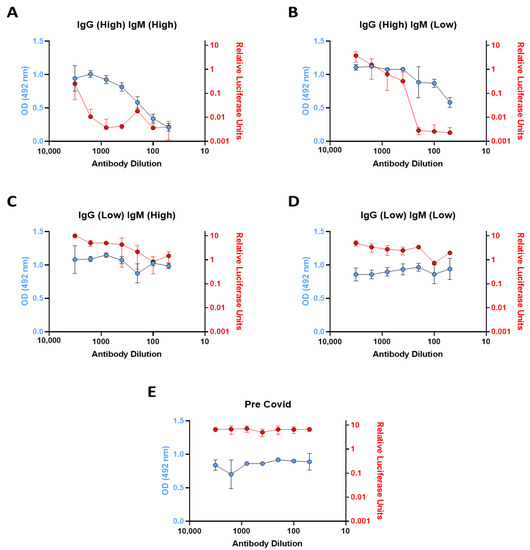 In order to investigate the neutralization capacity in selected patient samples, we integrated an in vitro ACE2 binding assay into the serology protocol. We performed the in vitro ACE2 binding assay using patient serum samples, which we categorized into four different immunoglobulin profiles by serology assay screening; (High IgG, High IgM), (High IgG, low IgM), (Low IgG, High IgM), and (low IgG, low IgM). Individual patient samples from each category were distinguished as high and low for each isotype based on the ratio to the cut-off value and the samples were taken 21–88 days post symptom onset (n = 3). A sample was considered to have a high reactivity for IgM if it was ≥3× the cut-off value or a high reactivity for IgG if it was ≥7× the cut-off value. Samples for both isotypes were considered to have a low reactivity if they were positive but <2× the cut-off value. These values are based on the maximum and minimum antibody reactivity for each isotype obtained during the prior serology analysis. From the serology, the portion of patient samples in these categories are as follows: 6.59% High IgG, High IgM; 14.3% High IgG, Low IgM; 4.4% Low IgG, High IgM; 5.5% Low IgG, Low IgM. In the patients considered to have high IgG1 and high IgM antibody reactivity, a 1 in 50 dilution of serum results in 80% reduction in the signal indicating potent neutralization (Figure 4A). While the High IgG1, Low IgM samples also possessed potent ACE2-binding neutralization capacity, particularly at lower dilutions, these were not as effective as the former (Figure 4B). Patients with low IgG and high IgM, along with low IgG and low IgM profiles, exhibited poor ACE2-binding neutralization capacity in comparison with the first two categories (Figure 4C,D). These patterns, as expected, were similar in two additional patient samples from these immunoglobulin profile categories. To correlate the activity in the ACE2-RBD binding assay we employed a pseudovirus neutralization assay derived from the previously published method [9], to test those sera. This system involves measuring the infection of stable ACE2-expressing HEK293T cells (Invivogen) with pseudovirus containing the SARS-CoV-2 spike protein, which expresses firefly luciferase on successful infection. Neutralizing capacity of post-infection sera can therefore be estimated through a decrease in luciferase activity when compared to control sera. Similar profiles were generated using this pseudovirus system shown in red, when compared to the in vitro ACE2 binding assay results shown in blue (Figure 4A–E). This indicates a consistent effect and a reasonable correlation between the in vitro ACE2 binding assay and the cell-based pseudovirus infection assay, which was expected given the pseudovirus system, while more complex, is also primarily based on the spike-ACE2 interaction, though in a pseudoviral cell infection model.