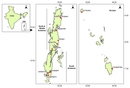 Map showing the sample collection sites in Andaman and Nicobar Archipelago (ANI), India. The wild shrimp and crab samples were collected from various fish landing centres located in all the three districts of ANI namely, North and Middle Andaman, South Andaman and Nicobar districts.