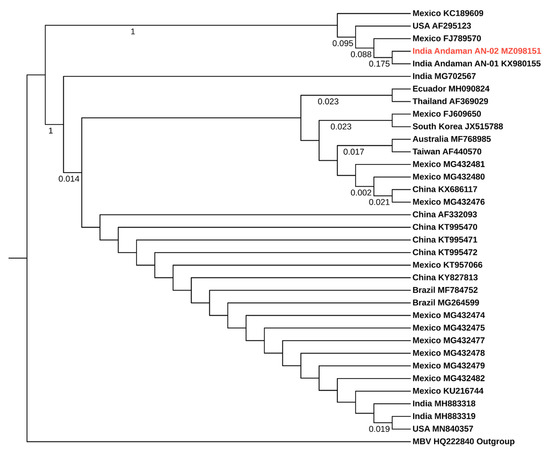 Phylogenetic tree of WSV285 gene of WSSV. The Genbank accession numbers are provided along with the country name and the WSSV sequence obtained in this present study (Genbank accession number MZ098151) was highlighted in red colour text. The tree was constructed using the maximum likelihood method with Tamura 3-parameter model (T92). The polyhedrin-like gene of monodon baculovirus (MBV) was used as an outgroup (Genbank accession number HQ222840).