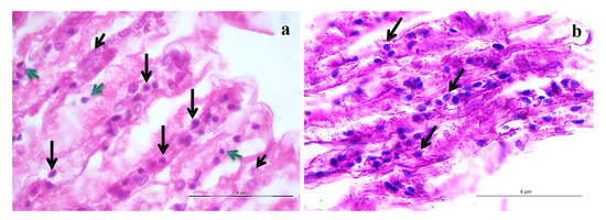 Histopathology of the shrimp (Penaeus monodon) gill sections. (a). Gill sections showing intra-nuclear eosinophilic cowdry type A inclusion bodies (long black arrow) pathognomonic to IHHNV and eosinophilic to basophilic inclusion bodies suggestive of WSSV infection (short green arrow) and normal cells (short black arrow). (b). Gill sections showing WSSV characteristic more basophilic intra-nuclear inclusion bodies (black arrow). Scale bar 4 µm.