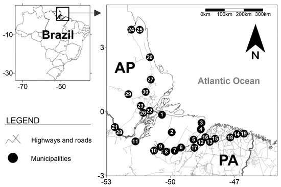 Geographical locations of the municipalities in the Amazon region where the people who used illicit drugs (PWUDs) were recruited for the study. The Brazilian states of Amapá and Pará are represented by the abbreviations AP and PA, respectively. The numbers from 1 to 30 indicate the municipalities where blood samples were collected, and information was provided by the PWUDs: (1) Afuá [number of PWUDs (n) = 21], (2) Anajás [n = 22], (3) Soure [n = 27], (4) Salvaterra [n = 23], (5) Ponta de Pedras [n = 18], (6) São Sebastião da Boa Vista [n = 19], (7) Curralinho [n = 85], (8) Bagre [n = 25], (9) Breves [n = 180], (10) Melgaço [n = 22], (11) Gurupá [n = 17], (12) Belém [n = 105], (13) Benevides [n = 21], (14) Bragança [n = 38], (15) Castanhal [n = 24], (16) Marituba [n = 59], (17) Abaetetuba [n = 20], (18) Capanema [n = 20], (19) Augusto Correa [n = 20], (20) Calçoene [n = 17], (21) Laranjal do Jari [n = 23], (22) Macapá [n = 69], (23) Mazagão [n = 28], (24) Oiapoque [n = 27], (25) Porto Grande [n = 18], (26) Santana [n = 55], (27) Tartarugalzinho [n = 15], (28) Vitória do Jari [n = 18], (29) Pedra Branca do Amapari [n = 17], and (30) Ferreira Gomes [n = 21].