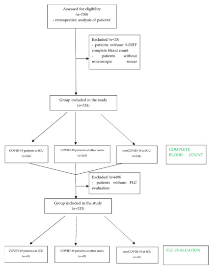 Ninety patients infected with SARS-CoV-2 were tested regarding the presence of free light immunoglobulin chains (FLCs) in serum. To compare FLC serum concentrations between COVID-19 and non-COVID-19 patients who required intensive care, 45 patients were selected from the 245 patients in the non-COVID ICU group, and their serum FLCs were tested. Finally, the FLC study group included 135 subjects. The enrolled study group consisted of 45 patients with COVID-19 hospitalized in the intensive care unit (COVID ICU), 43 patients with COVID-19 hospitalized at other hospital units (COVID non-ICU), and 45 ICU patients in which COVID-19 had not been diagnosed (control group: non-COVID ICU). The COVID-19 ICU patient group was composed of 135 men with a mean age of 63 ± 13.4 and 112 women with a mean age of 81 ± 16.1. The mean age of the COVID-19 non-ICU group was 58 ± 11.5 for men and 62 ± 17.4 for women. The non-COVID ICU group was composed of 135 men, mean age 60 ± 17.39, and 112 women, mean age 61 ± 16.53. From each ICU group (COVID ICU and non-COVID ICU), 45 patients (33 men and 12 women) were selected, and 43 patients (31 men and 12 women) were selected from the COVID non-ICU group; these patients were referred for microscopical smear analysis and assessment of serum FLCs. The inclusion scheme is presented in Figure 1. When selecting a group of patients in order to assess the dependence of the number of lymphocytes synthesizing antibodies and the assessment of light chains in relation to the severity of the disease, the factor selecting the group of patients was the assessment of light chains (FLCs) ordered by a physician in patients hospitalized in our medical unit.