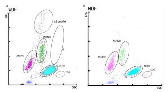 Automatic analysis of peripheral blood allowed obtaining a WBC differential fluorescence (WDF) scattergram in which the numerical differences in the selected WBC counts were easy to observe (Figure 2).