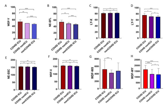 Cell population data (CPD) analysis of graphical results (WDF scattergram) including leukocyte differentiation in three groups: COVID ICU, COVID non-ICU, and non-COVID ICU. A -WDF-Y leucocyte fluorescence (leucocyte size), B - NE-SFL, the fluorescent light intensity of the NEUT area on the WDF scattergram (neutrophils size), C- LY-X, the lateral scattered light intensity of the LYMPH area on the WDF scattergram (lymphocyte granularity and the amount of genetic material), D - LY-Y, the fluorescent light intensity of the LYMPH area on the WDF scattergram (lymphocyte size), E - NE-SSC, the lateral scattered light intensity of the NEUT area on the WDF scattergram (neutrophils granularity and the amount of genetic material), F - WDF-X leucocyte complexity (leucocyte granularity and amount of genetic material), G - WDF-WX width of dispersion of leucocyte (leucocytes granularity and the amount of genetic material), H - WDF-WY width of dispersion of leucocyte fluorescence (leucocytes size); (n = 735, *p < 0.05, **p < 0.01, ****p < 0.0001).