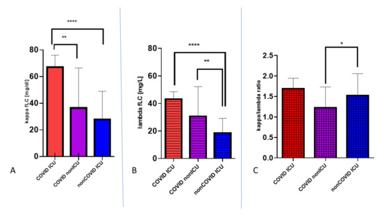 The differences between the concentrations of kappa and lambda chains in patients from the COVID ICU, COVID non-ICU, and non-COVID ICU groups prove that infection with SARS-CoV-2 stimulates FLC synthesis in the human body, most importantly in the group of COVID-19 patients hospitalized in the intensive care unit. Here, we report that there were also significant differences in the rate of light immunoglobulin chain synthesis during infection, with a significant predominance of κ chains. This is probably related to the rate of gene activation for the kappa light chain reported in the literature. The activation of the gene on chromosome 2 responsible for the synthesis of the kappa chain is slightly faster than the activation of the gene on chromosome 22 responsible for the synthesis of the lambda chain [27].