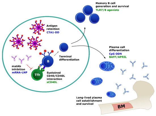 Persistence of GC-derived humoral responses. Prolongation of the germinal center reaction is associated with higher rates of SHM, increased differentiation of LLPCs, and improved generation of broadly neutralizing antibody. Extending the availability of antigen in the GC appears to sustain the GC reaction; if B cells have no antigen to present, they cannot obtain T cell help. Even after successful induction of GC responses, young infants are particularly prone to transient reactions. Once these differentiated B cells exit the germinal center, they face the challenge of continued survival, which is particularly difficult for newborn LLPCs colonizing the immature bone marrow (BM) niche. Adjuvants in blue have demonstrated effects in newborns or young infants, while those in green have been shown to work in adults. Whether they can modulate the indicated responses in young infants is yet to be explored.